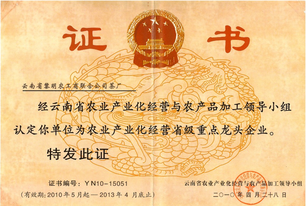 發證機構:   云南省農業產業化經營與農產品加工領導小組 發證時間 :   2010-04-28
