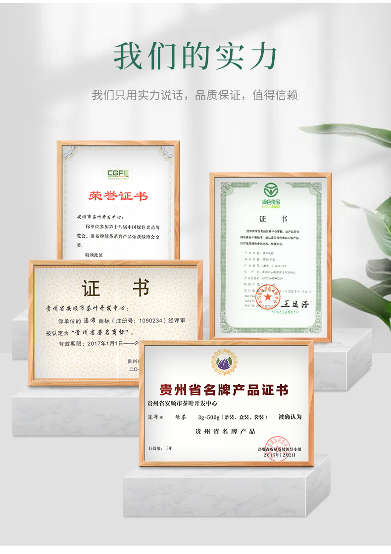 瀑布茶品牌是安順市人民政府主打茶葉品牌,省級重點打造區(qū)域公共品牌,屬貴州五大名茶,先后獲得獲“中國農(nóng)產(chǎn)品區(qū)域公用品牌”、“貴州省著名商標”“貴州省名牌產(chǎn)品”等榮譽稱號近年來,在各級部門大力推動下,瀑布茶品牌不斷發(fā)展壯大。截止目前,現(xiàn)有瀑布茶品牌加盟企業(yè)23家,輻射茶園面積200000余畝其中綠色食品認證茶園基地面積7000余畝,有機食品認證基地面積2500畝擁有“瀑布毛峰”、“瀑布翠芽”“瀑布紅茶”、“瀑布翠龍”等產(chǎn)品,多次獲得“中綠杯”、“中茶杯”、“華茗杯”大獎;分別榮獲14屆中國國際農(nóng)產(chǎn)品交易會金獎18屆中國綠色食品博覽會金獎“黃山杯”首屆全國傳統(tǒng)名茶產(chǎn)品質(zhì)量特別金獎、安順十大旅游商品等殊榮及稱號。