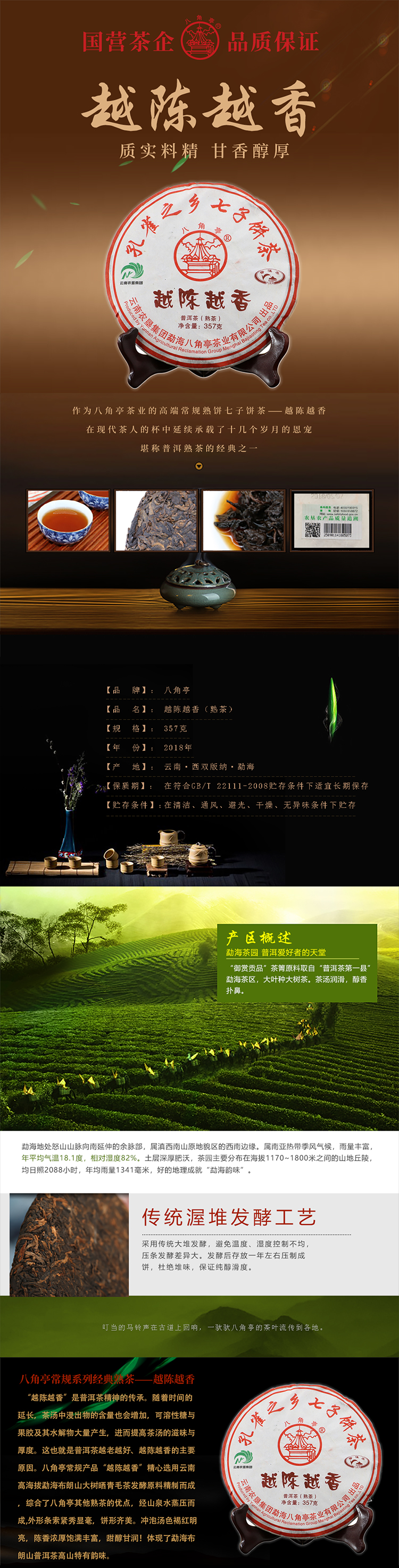 云墾茶業(yè)集團下屬茶葉生產(chǎn)企業(yè)——云南農(nóng)墾集團勐海八角亭茶業(yè)有限公司原名黎明茶廠,是我國歷史最為悠久的茶企之一,曾位列“中國普洱茶十大知名品牌”“十大最受歡迎茶葉品牌”、“中國普洱茶十大暢銷品牌”中,成為今天市場上最有影響力的品牌之一。公司產(chǎn)品獲得“綠色食品”、ISO9001、 HACCP和云茶品牌(YC)4項認證,連續(xù)獲得“云南名牌農(nóng)產(chǎn)品”“云南名牌產(chǎn)品”“云南省著名商標”等品牌榮譽,公司生產(chǎn)的多款普洱茶在歷次專業(yè)評比中多次獲得特等金獎和金獎。在2018第五屆中國企業(yè)五星品牌論壇上,云南農(nóng)墾集團勐海八角亭茶業(yè)有限公司上榜中國普洱茶行業(yè)影響力品牌——“金芽獎”,公司負責人陳勝軍先生獲“陸羽獎”,被授予2017“國際十大杰出茶人”榮譽稱號。